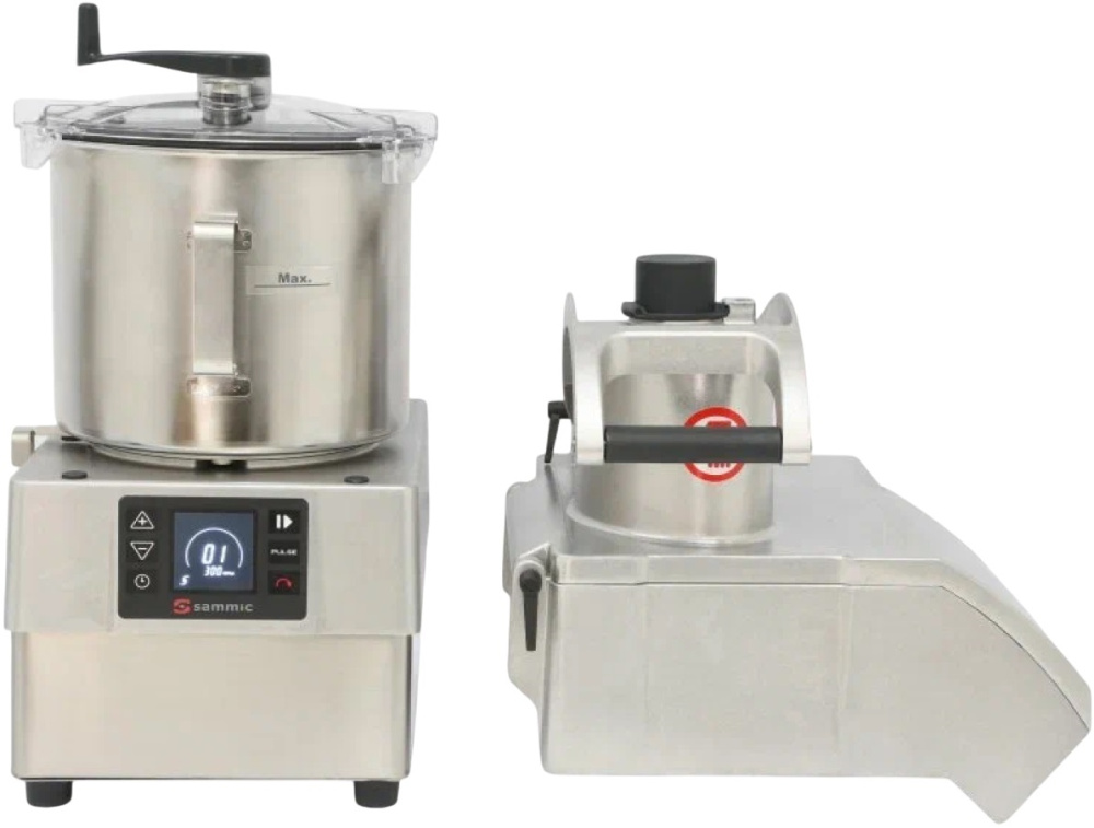 Кухонный процессор Sammic CK-38V используется на предприятиях общественного питания, торговли и пищевых производствах для всех видов нарезки, измельчения и смешивания продуктов питания. Модель оснащена электронным управлением, таймером, режущей головкой, чашей с боковыми полостями, зазубренными лезвиями и эргономичной ручкой. Материал корпуса, моторного блока и бункера - нержавеющая сталь, материал головки - пищевой алюминий, материал крышки - поликарбонат.