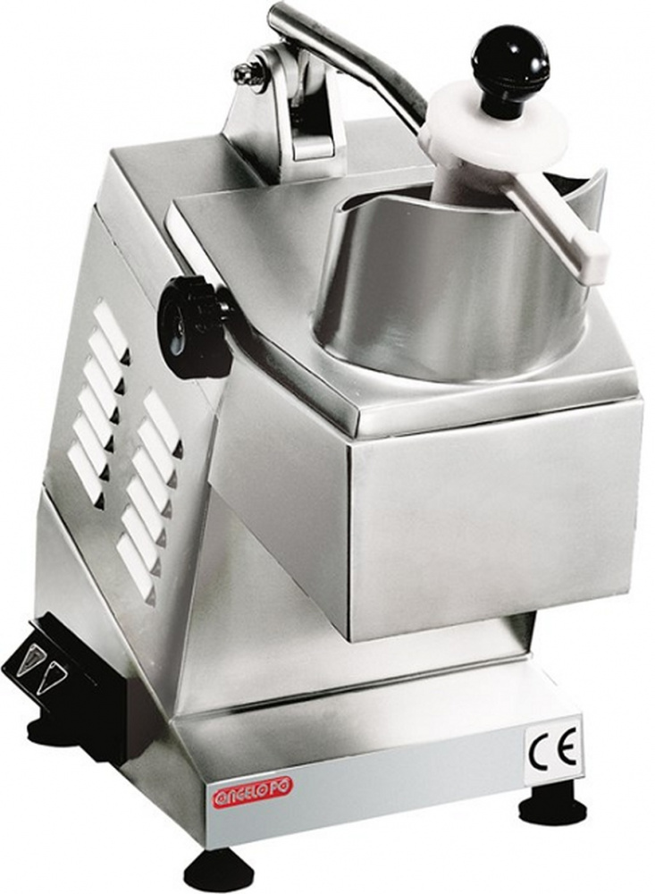 Овощерезка Angelo Po STV с одной скоростью вращения дисков. Корпус овощерезательной машины изготовлен из анодированного алюминия. Бункер подачи овощей имеет одно D-образное отверстие. Крышка отсека нарезания откидная. Есть диск-сбрасыватель.