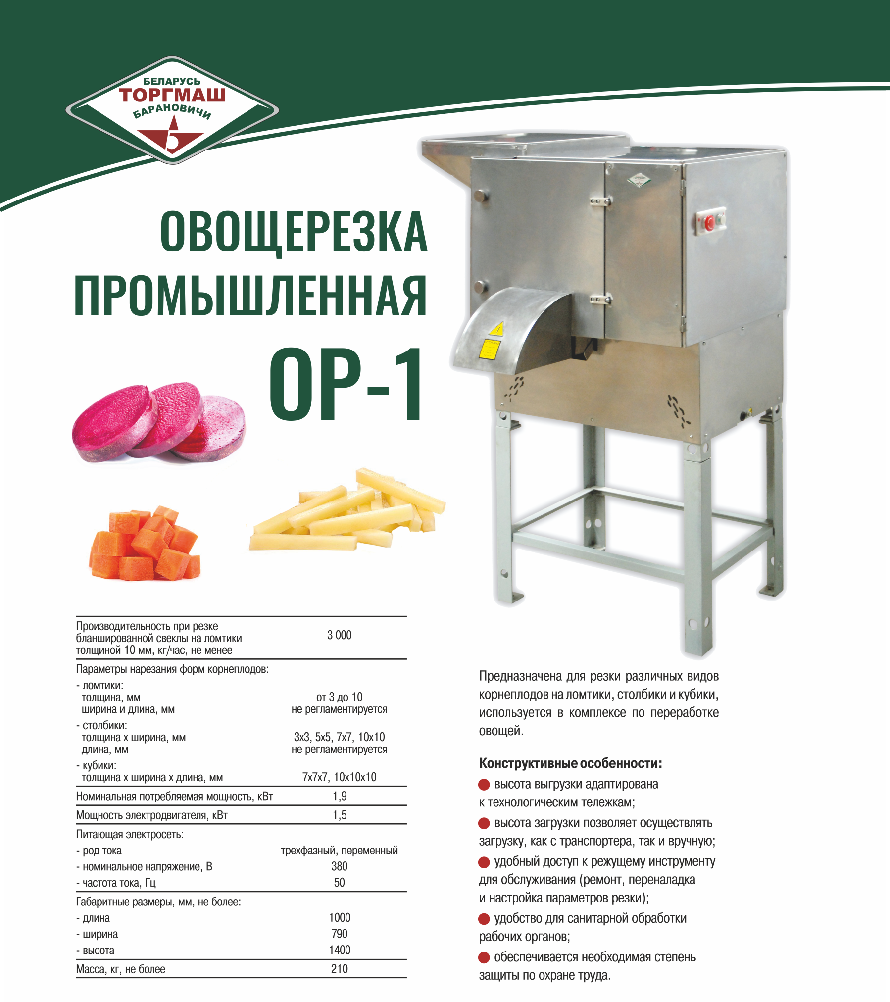 • Производительность при резке бланшированной свеклы на ломтики толщиной 10 мм: 3000 кг/ч