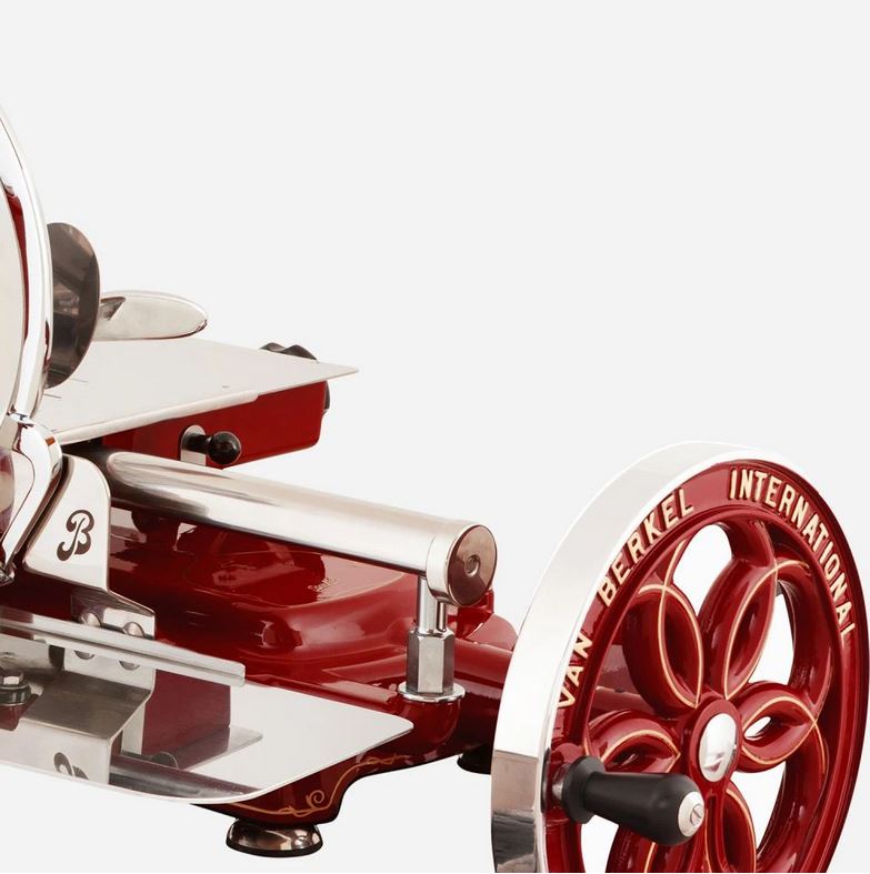 Слайсер Berkel Flywheel (Volano) B114 красный используется на предприятиях общественного питания, торговли и пищевых производствах для нарезки мяса, рыбы, хлеба, овощей, сыра, колбасных изделий и других продуктов. Модель оснащена встроенным заточным устройством для ножа, регулировкой толщины нарезки и прорезиненные ножки. Материал корпуса - алюминий, материал ножа - хромированная сталь.