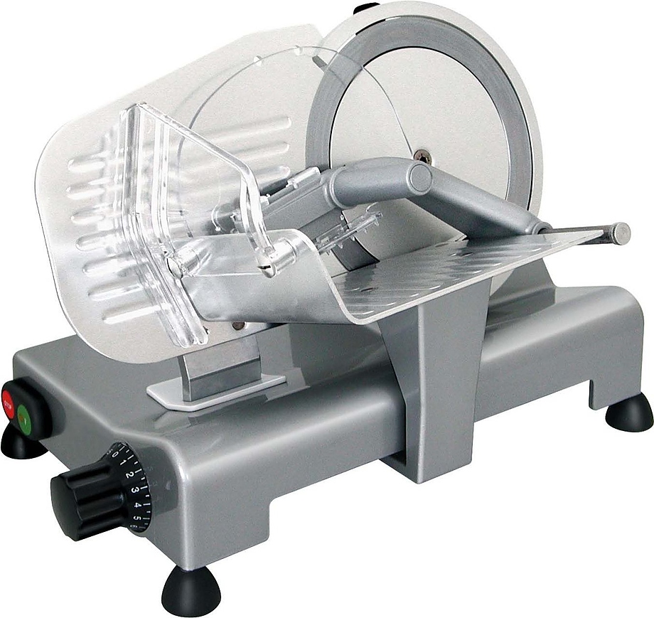 Профессиональный мотор с функцией принудительной вентиляции исключает возможность перегрева устройства, а также делает его работу практически бесшумной. Поддон для продуктов, перемычка для регулирования толщины среза и кольцо фиксации лезвия выполнены из алюминия, отполированного путем анодирования, что обеспечивает их гигиеническую чистоту и защиту от коррозии.