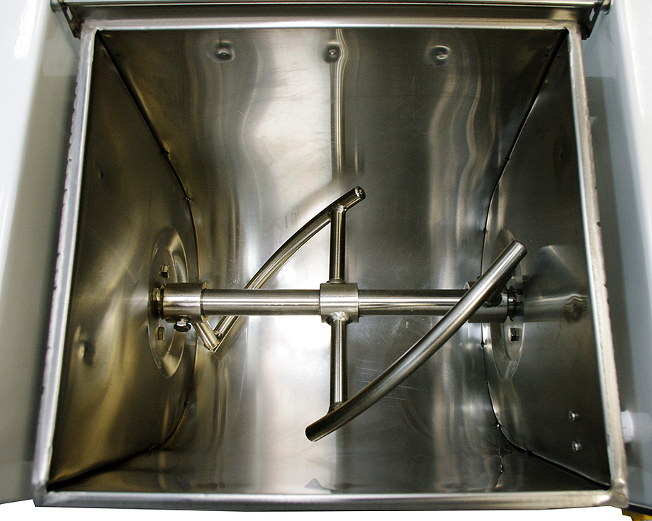 Верхняя откидная крышка позволяет добавлять ингридиенты в процессе замешивания. Большое смотровое окно позволяет наблюдать за процессом. Материал корпуса - эмалированный металл, внутренняя поверхность дежи и мешалка выполнены из нержавеющей стали AISI 304.