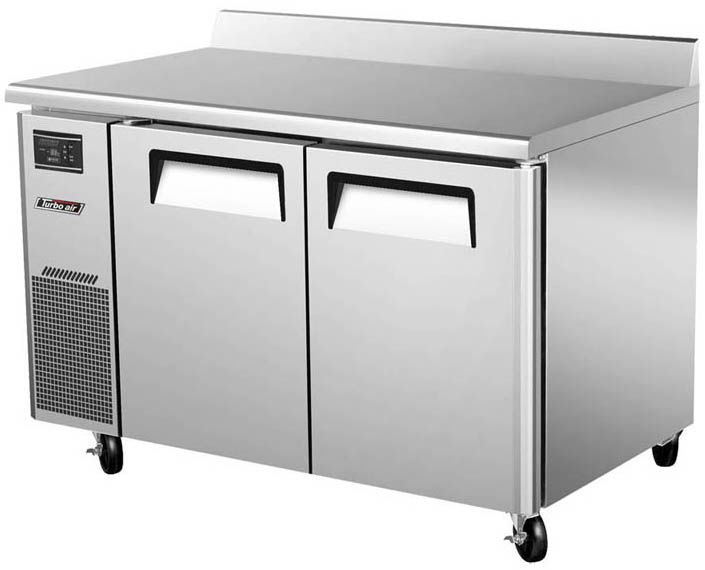 Холодильный стол Turbo air KWR12-2 предназначен для раскатки теста, обработки, охлаждения и кратковременного хранения продуктов и напитков на предприятиях общественного питания и торговли. Корпус выполнен из нержавеющей стали (гальванизированная сталь на оборотной стороне и внизу) с применением пожаробезопасных стенок толщиной 60 мм, уплотнения - из АБС-пластика (акрилонитрилбутадиенстирола), не пропускающего конденсата, пол - из нержавеющей стали с алюминиевыми вставками по бокам и сзади оборудования, регулируемые полки - из толстой стальной проволоки с виниловым покрытием.