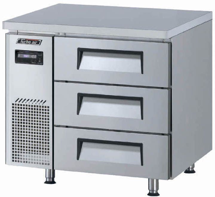 Холодильный стол Turbo air KUR9-3D-3 предназначен для раскатки теста, обработки, охлаждения и кратковременного хранения продуктов и напитков на предприятиях общественного питания и торговли. Корпус выполнен из нержавеющей стали (гальванизированная сталь на оборотной стороне и внизу) с применением пожаробезопасных стенок толщиной 60 мм, уплотнения - из АБС-пластика (акрилонитрилбутадиенстирола), не пропускающего конденсата, пол - из нержавеющей стали с алюминиевыми вставками по бокам и сзади оборудования, тройные направляющие - из высококачественной нержавеющей стали.