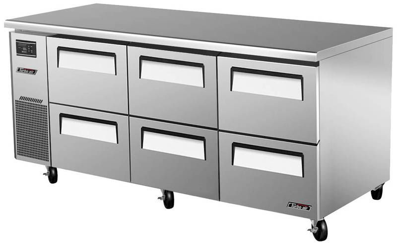 Холодильный стол Turbo air KUR18-2D-6 предназначен для раскатки теста, обработки, охлаждения и кратковременного хранения продуктов и напитков на предприятиях общественного питания и торговли. Корпус выполнен из нержавеющей стали (гальванизированная сталь на оборотной стороне и внизу) с применением пожаробезопасных стенок толщиной 60 мм, уплотнения - из АБС-пластика (акрилонитрилбутадиенстирола), не пропускающего конденсата, пол - из нержавеющей стали с алюминиевыми вставками по бокам и сзади оборудования, тройные направляющие - из высококачественной нержавеющей стали.