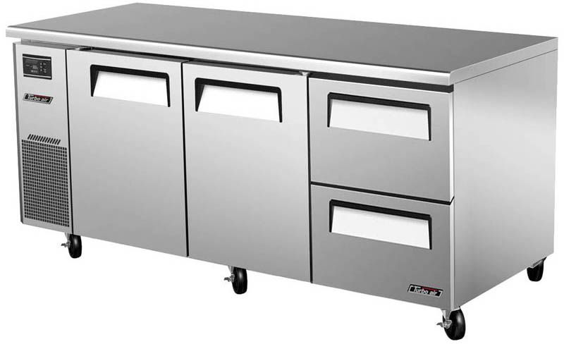 Холодильный стол Turbo air KUR18-2D-2 предназначен для раскатки теста, обработки, охлаждения и кратковременного хранения продуктов и напитков на предприятиях общественного питания и торговли. Корпус выполнен из нержавеющей стали (гальванизированная сталь на оборотной стороне и внизу) с применением пожаробезопасных стенок толщиной 60 мм, уплотнения - из АБС-пластика (акрилонитрилбутадиенстирола), не пропускающего конденсата, пол - из нержавеющей стали с алюминиевыми вставками по бокам и сзади оборудования, тройные направляющие - из высококачественной нержавеющей стали.