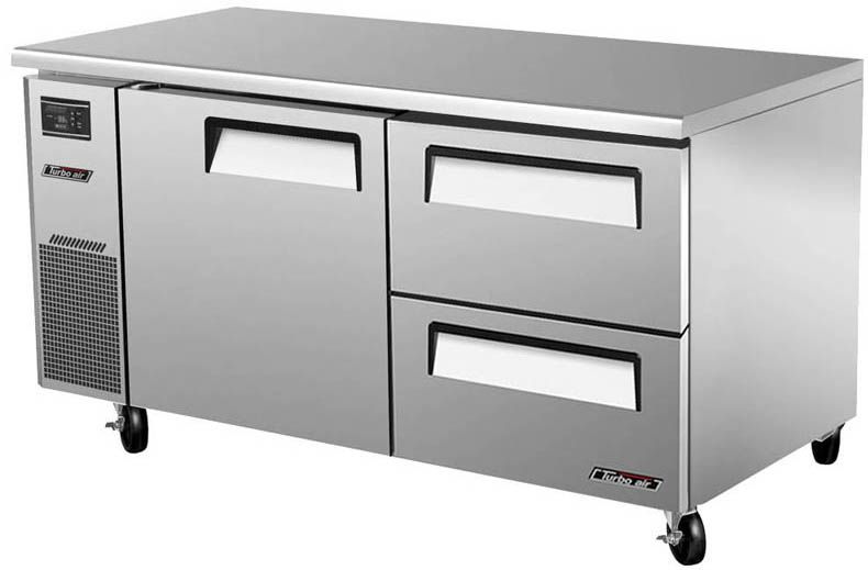 Холодильный стол Turbo air KUR15-2D-2 предназначен для раскатки теста, обработки, охлаждения и кратковременного хранения продуктов и напитков на предприятиях общественного питания и торговли. Корпус выполнен из нержавеющей стали (гальванизированная сталь на оборотной стороне и внизу) с применением пожаробезопасных стенок толщиной 60 мм, уплотнения - из АБС-пластика (акрилонитрилбутадиенстирола), не пропускающего конденсата, пол - из нержавеющей стали с алюминиевыми вставками по бокам и сзади оборудования, тройные направляющие - из высококачественной нержавеющей стали.