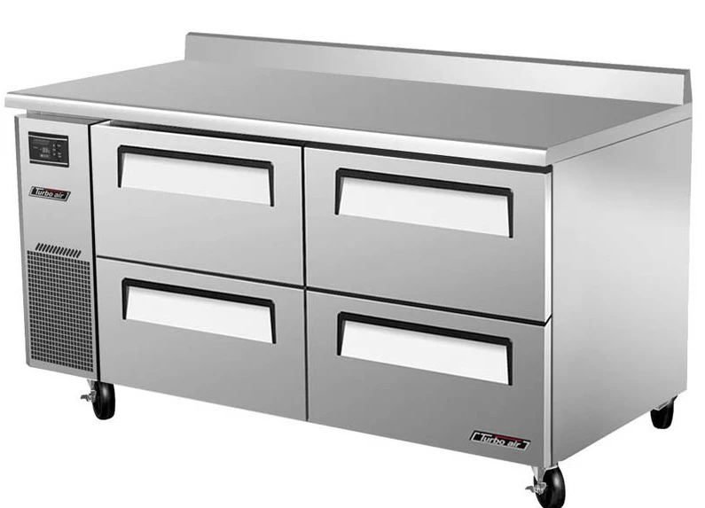 Холодильный стол Turbo air KWR15-2D-4-750 используется для охлаждения, заморозки и длительного хранения пищевых продуктов, а также для обработки ингредиентов на предприятиях общественного питания, торговли и пищевых производствах. Динамическая система охлаждения. Стол установлен на 4 колесах, оснащен 4 ящиками. Материал корпуса, ножек и направляющих - нержавеющая сталь, материал задней и нижней панелей - гальванизированная сталь, материал пола - нержавеющая сталь с алюминиевыми вставками, материал полок - толстая стальная проволока с виниловым покрытием, материал уплотнения - ABS-пластик.