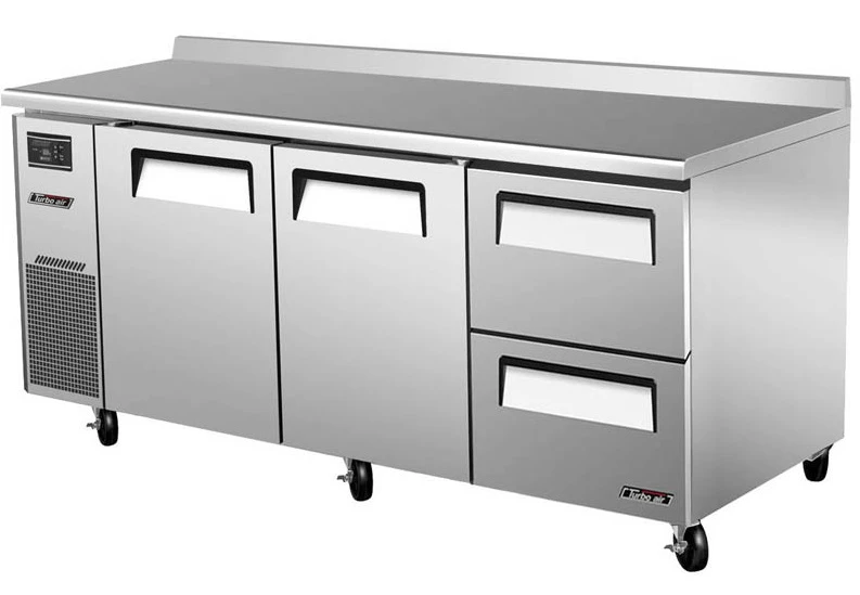 Холодильный стол Turbo air KWR18-2D-2-700 используется для охлаждения, заморозки и длительного хранения пищевых продуктов, а также для обработки ингредиентов на предприятиях общественного питания, торговли и пищевых производствах. Динамическая система охлаждения. Стол установлен на 6 колесах, оснащен 2 дверьми, 2 полками и 3 ящиками. Материал корпуса и направляющих - нержавеющая сталь, материал задней и нижней панелей - гальванизированная сталь, материал пола - нержавеющая сталь с алюминиевыми вставками, материал полок - толстая стальная проволока с виниловым покрытием, материал уплотнения - ABS-пластик.