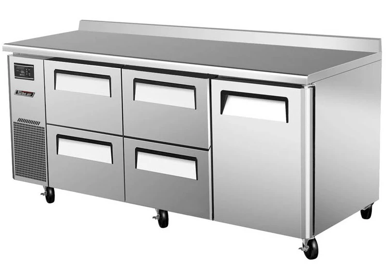 Холодильный стол Turbo air KWR18-2D-4-750 используется для охлаждения, заморозки и длительного хранения пищевых продуктов, а также для обработки ингредиентов на предприятиях общественного питания, торговли и пищевых производствах. Динамическая система охлаждения. Стол установлен на 6 колесах, оснащен дверью, полкой и 4 ящиками. Материал корпуса и направляющих - нержавеющая сталь, материал задней и нижней панелей - гальванизированная сталь, материал пола - нержавеющая сталь с алюминиевыми вставками, материал полок - толстая стальная проволока с виниловым покрытием, материал уплотнения - ABS-пластик.