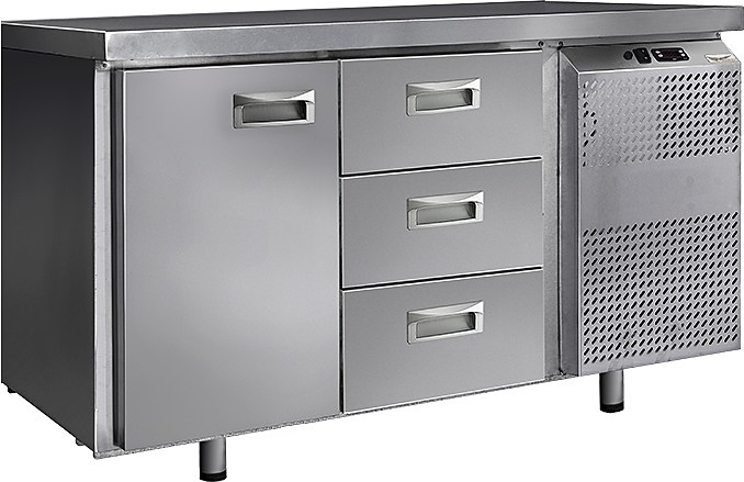 Холодильный стол Finist СХС-700-1/3 используется на предприятиях общественного питания, торговли и пищевых производствах для хранения и обработки полуфабрикатов из мяса и рыбы, заготовок для салата, охлажденных напитков и прочих пищевых продуктов. Управление при помощи кнопочной панели управления, оснащенной цифровым дисплеем. Холодильная камера с распашной дверцей, 3 выдвижных ящика, агрегатный отсек располагается сбоку. Стол установлен на ножки с подпятниками. Материал корпуса - нержавеющая сталь.