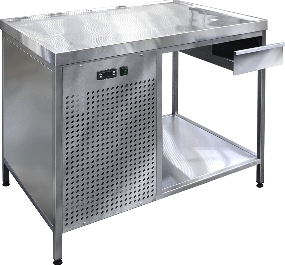 Холодильный стол Finist СХСо-1100-700 используется на предприятиях общественного питания, торговли и пищевых производствах для хранения и обработки полуфабрикатов из мяса и рыбы, заготовок для салата, охлажденных напитков и прочих пищевых продуктов. Управление при помощи кнопочной панели управления, оснащенной цифровым дисплеем. Охлаждаемая рабочая поверхность, выдвижной ящик-лоток, открытая полка для хранения продукции и инвентаря. Холодильный агрегат располагается сбоку. Стол установлен на ножки с подпятниками. Материал корпуса - нержавеющая сталь.