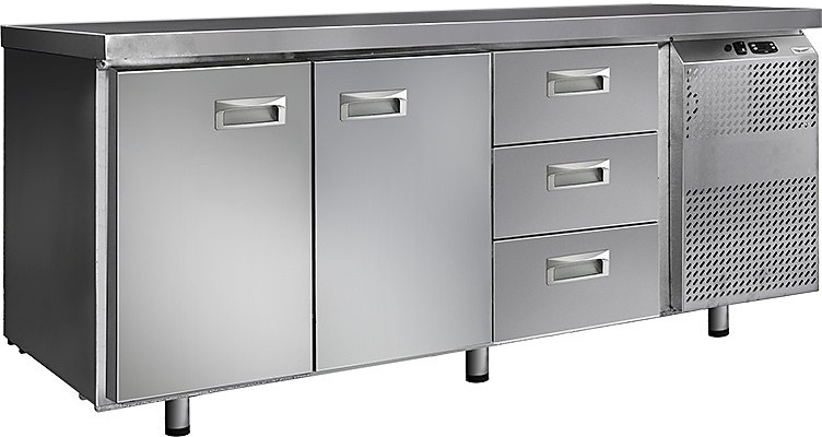 Холодильный стол Finist СХС-700-2/3 используется на предприятиях общественного питания, торговли и пищевых производствах для хранения и обработки полуфабрикатов из мяса и рыбы, заготовок для салата, охлажденных напитков и прочих пищевых продуктов. Управление при помощи кнопочной панели управления, оснащенной цифровым дисплеем. 2 холодильные камеры с распашными дверцами, 3 выдвижных ящика, агрегатный отсек располагается сбоку. Стол установлен на ножки с подпятниками. Материал корпуса - нержавеющая сталь.
