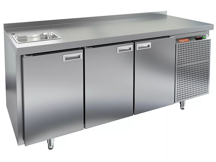 Холодильный стол HICOLD SN 11/TN 1G используется на предприятиях общественного питания, торговли и пищевых производствах для обработки различных ингредиентов и хранения продуктов, напитков и кухонных принадлежностей. Модель оснащена моечной ванной, электронной панелью управления, динамической системой охлаждения, автоматической оттайкой, дверцами и регулируемыми ножками. Материал корпуса и столешницы - высококачественная нержавеющая сталь.