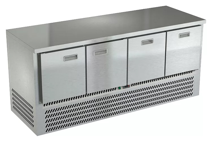 Холодильный стол Техно-ТТ СПН/О-122/22-1906 предназначается для раскатки теста, обработки, охлаждения и кратковременного хранения продуктов и напитков на предприятиях общественного питания, торговли и пищевых производствах. Секции оснащены направляющими и решетчатыми полками, двери и ящики - доводчиками. Материал корпуса и столешницы - нержавеющая сталь AISI 430, материал задней панели и дна - оцинкованная сталь.