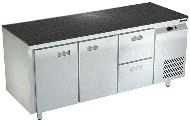 Холодильный стол Техно-ТТ СПБ/О-322/22-1807 предназначается для раскатки теста, обработки, охлаждения и кратковременного хранения продуктов и напитков на предприятиях общественного питания, торговли и пищевых производствах. Секции оснащены направляющими и ящиками с доводчиками. Материал корпуса - нержавеющая сталь AISI 430, материал столешницы - гранит (толщина 20 мм), материал задней панели и дна - оцинкованная сталь.