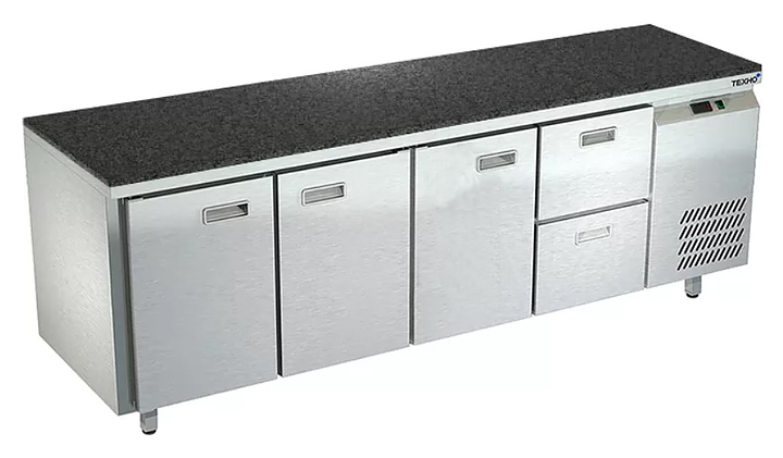 Холодильный стол Техно-ТТ СПБ/О-322/32-2206 предназначается для раскатки теста, обработки, охлаждения и кратковременного хранения продуктов и напитков на предприятиях общественного питания, торговли и пищевых производствах. Секции оснащены направляющими и ящиками с доводчиками. Материал корпуса - нержавеющая сталь AISI 430, материал столешницы - гранит (толщина 20 мм), материал задней панели и дна - оцинкованная сталь.