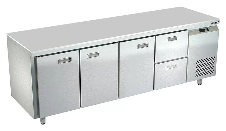 Холодильный стол Техно-ТТ СПБ/О-522/32-2207 предназначается для раскатки теста, обработки, охлаждения и кратковременного хранения продуктов и напитков на предприятиях общественного питания, торговли и пищевых производствах. Секции оснащены направляющими и ящиками с доводчиками. Материал корпуса - нержавеющая сталь AISI 430, материал столешницы - полипропилен (толщина 20 мм), материал задней панели и дна - оцинкованная сталь.