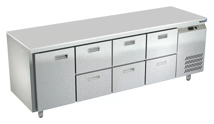 Холодильный стол Техно-ТТ СПБ/О-522/16-2207 предназначается для раскатки теста, обработки, охлаждения и кратковременного хранения продуктов и напитков на предприятиях общественного питания, торговли и пищевых производствах. Секции оснащены направляющими и ящиками с доводчиками. Материал корпуса - нержавеющая сталь AISI 430, материал столешницы - полипропилен (толщина 20 мм), материал задней панели и дна - оцинкованная сталь.