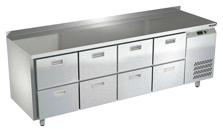 Холодильный стол Техно-ТТ СПБ/Т-223/08-2207 предназначается для раскатки теста, обработки продуктов и ингредиентов, заморозки и хранения продукции, а также для размещения теплового оборудования на предприятиях общественного питания, торговли и пищевых производствах. Двери оснащены доводчиками. Материал корпуса и столешницы - нержавеющая сталь AISI 430, материал дна и задней панели - оцинкованная сталь.