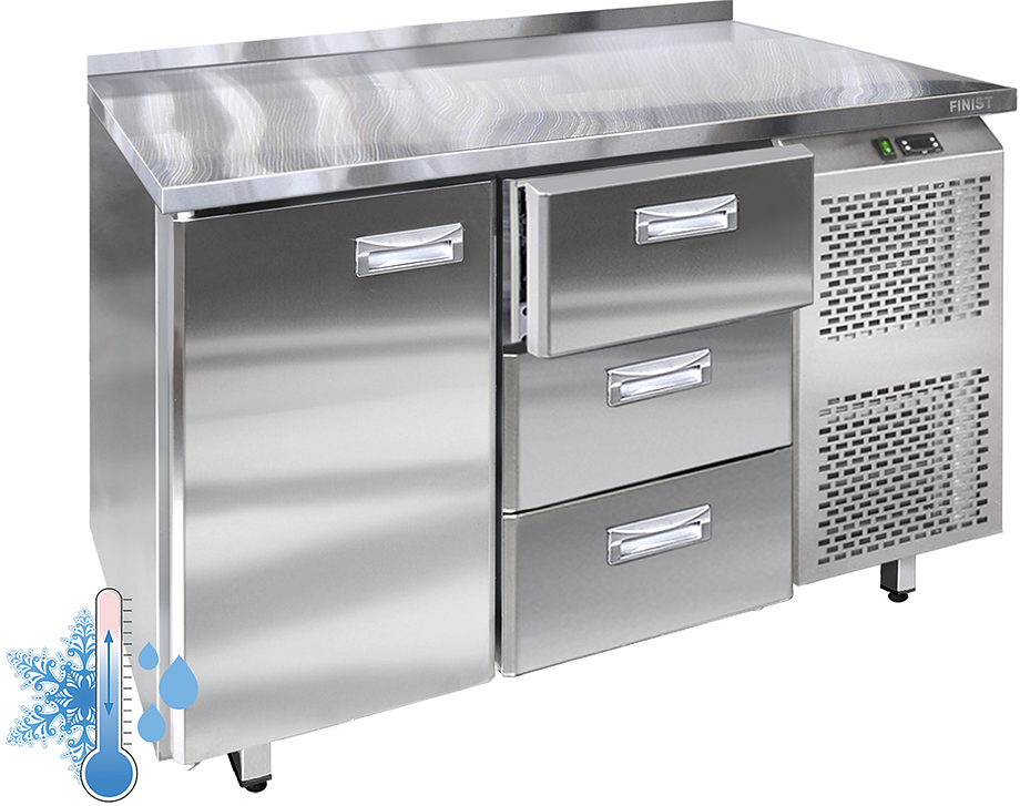 Холодильный стол Finist УХС-700-1/3 используется на предприятиях общественного питания, торговли и пищевых производствах для хранения и обработки полуфабрикатов из мяса и рыбы, заготовок для салата, охлажденных напитков и прочих пищевых продуктов. Управление при помощи кнопочной панели управления, оснащенной цифровым дисплеем. 1 холодильная камера с распашными дверцами, 1 секция с 3 выдвижными ящиками с доводчиками, агрегатный отсек располагается сбоку. Стол установлен на ножки с подпятниками. Материал корпуса - нержавеющая сталь.