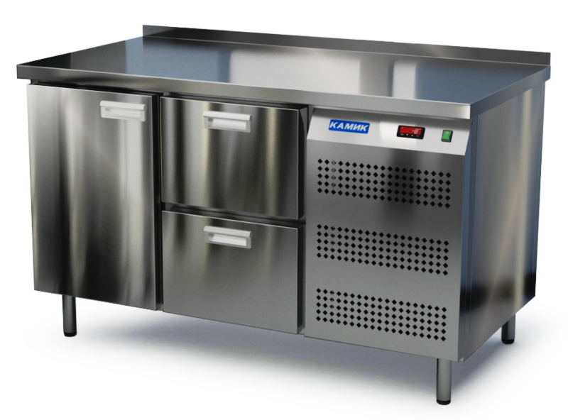 Холодильный стол КАМИК СО-12148 используется на предприятиях общественного питания и торговли для охлаждения и хранения продуктов, напитков и готовых блюд. Конструкция разделена на секции, каждая из которых оборудована сетчатой полкой и парой направляющих. Корпус выполнен из нержавеющей стали AISI 430 толщиной 1 мм, столешница - из нержавеющей стали AISI 304 толщиной 1,5 мм.