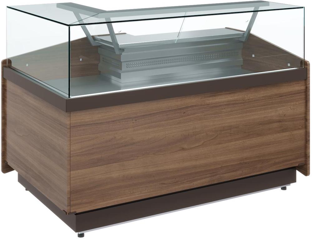 Угловая кондитерская витрина Carboma KC82 SM-5 01 используется на предприятиях общественного питания и торговли для демонстрации, охлаждения и кратковременного хранения тортов, пирожных и других кондитерских изделий. Модель оснащена прямым передним стеклом и регулируемыми ножками высотой от 30 до 50 м. Корпус выполнен из стали с ППУ-теплоизоляцией, зона выкладки и столешница - из нержавеющей стали, раздвижные задние створки - из оргстекла, передняя панель - из МДФ белого цвета или декорированного под дерево.