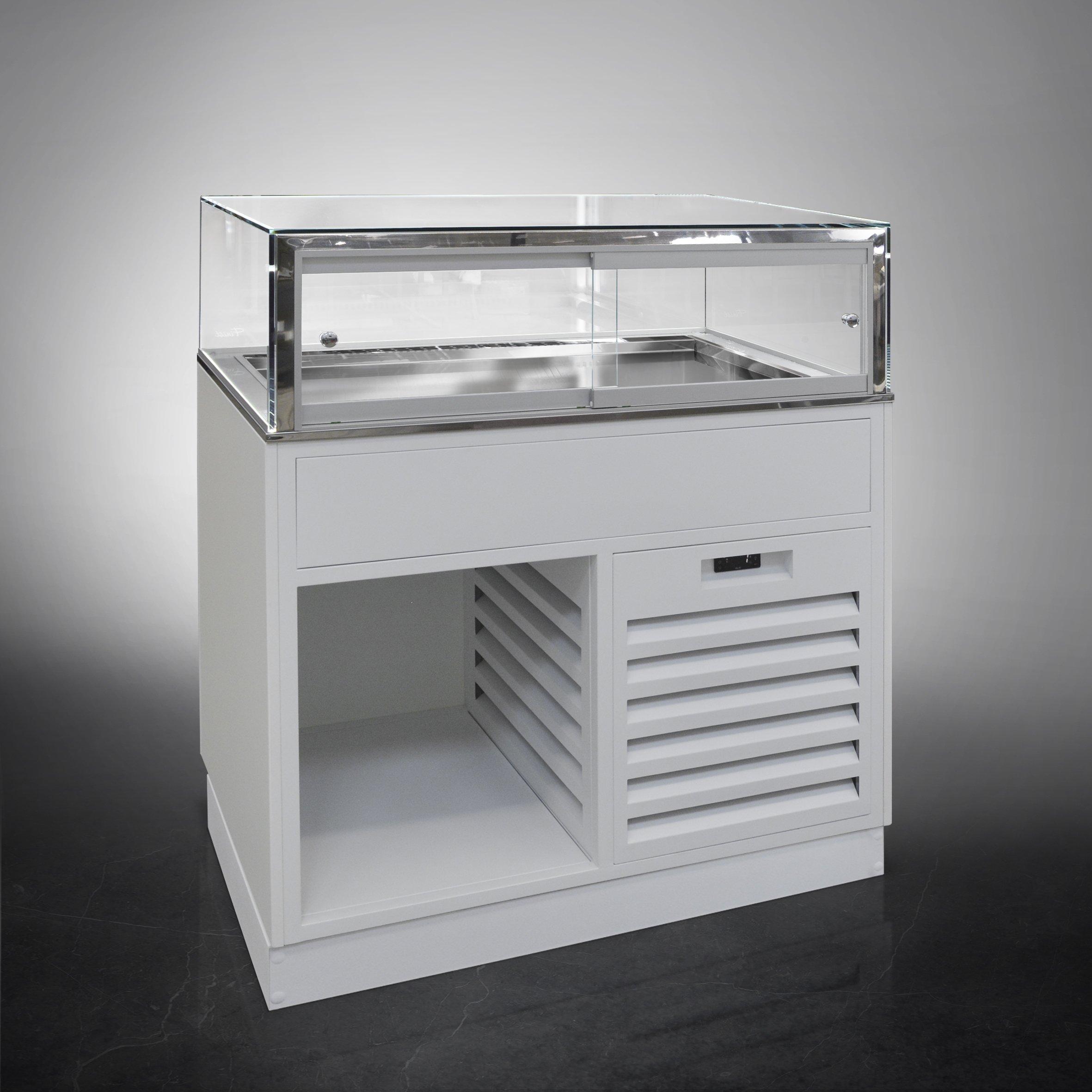 Холодильная витрина Finist GLASSIER LUX GL812-15/55/5 используется для демонстрационной выкладки, охлаждения и хранения кондитерских и хлебобулочных изделий на предприятиях общественного питания и торговли. Модель оснащена микропроцессорным блоком, автоматической оттайкой, цоколем, светодиодной подсветкой, стеклянной полкой и удобными дверцами купе. Материал фронтальных и боковых панелей облицовки - МДФ панели, материал купола - просветленное стекло, материал дна - высококачественная нержавеющая сталь.
