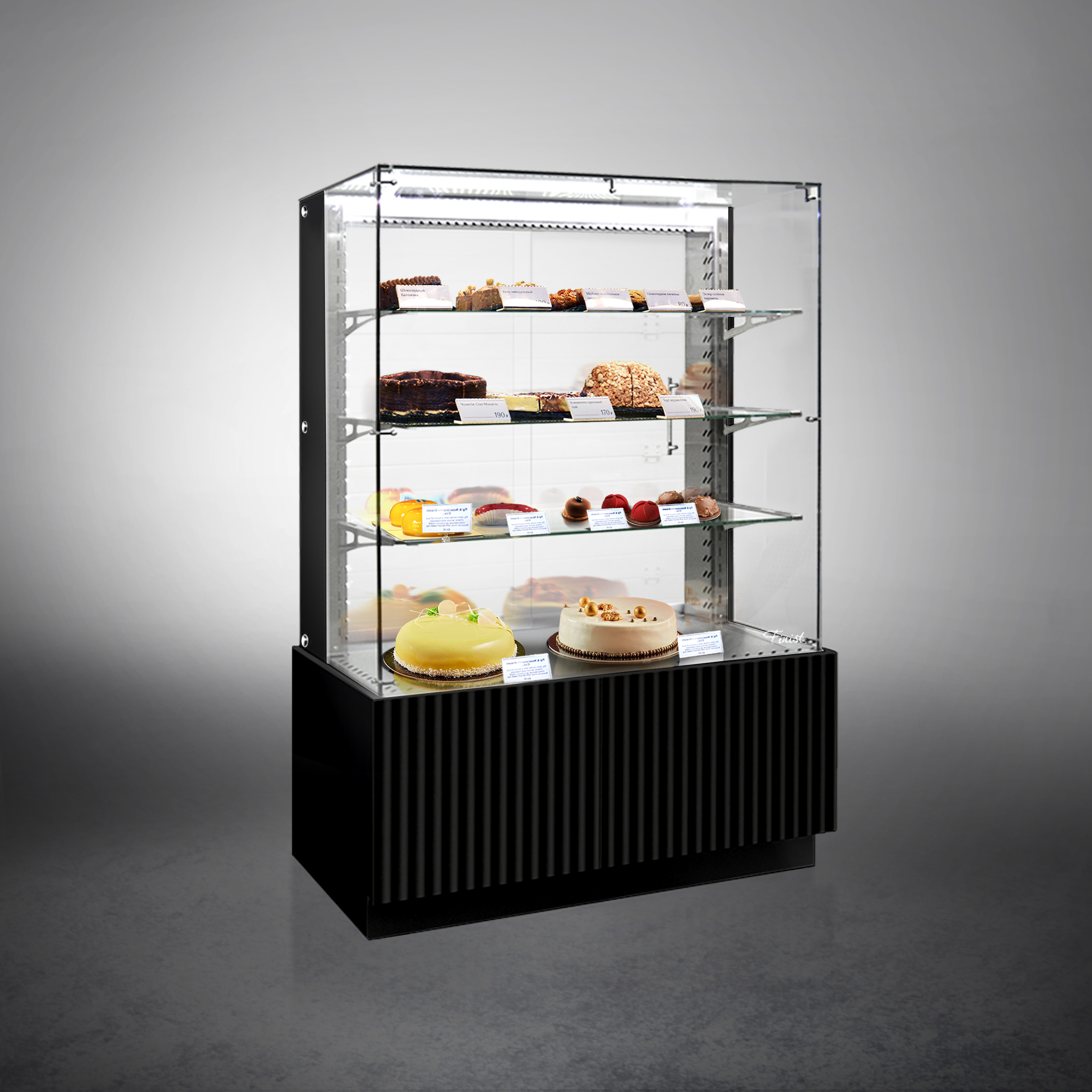 Холодильная витрина Finist AIR LUX AL-11-7-163 используется для демонстрационной выкладки, охлаждения и хранения кондитерских и хлебобулочных изделий на предприятиях общественного питания и торговли. Модель оснащена микропроцессорным блоком, автоматической оттайкой, светодиодной подсветкой каждой полки, 3 стеклянными полками и удобными дверцами купе. Материал фронтальных и боковых панелей облицовки - МДФ панели, материал купола и полок - просветленное стекло, материал дна - зеркальная нержавеющая сталь.