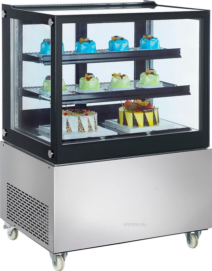 Кондитерская витрина Koreco RARC270Z используется на предприятиях общественного питания и торговли для демонстрации, охлаждения и кратковременного хранения тортов, пирожных и других кондитерских изделий. Стенд выполнен из из нержавеющей стали, фронтальное, боковые и верхнее стекла - из тройного стеклопакета, полки - хромированные.