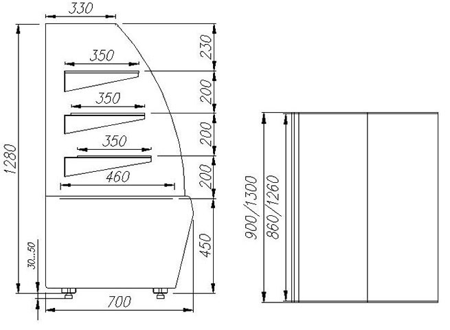 Кондитерская витрина Carboma K70 VV 0,9-1 (ВХСв - 0,9д Люкс Техно) используется на предприятиях общественного питания и торговли для демонстрации, охлаждения и кратковременного хранения тортов, пирожных и других кондитерских изделий. Модель оснащена изогнутым стеклопакетом с раздвижными задними створками на роликах, 3 охлаждаемыми фиксированными полками и регулируемыми ножками высотой от 30 до 50 мм. Основание и декоративные панели выполнены из стали, боковины - из металла.