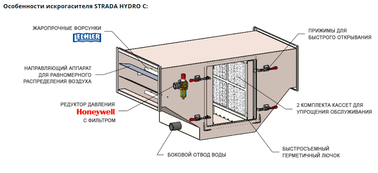 Искрогаситель STRADA HYDRO C 7,0 предназначен для гашения искр пламени от мангалов, грилей и угольных печей на предприятиях общественного питания и торговли. Модель оснащена 6 жаропрочными форсунками с улучшенными характеристиками для максимального гашения искр, многослойной сетчатой кассетой из гофрированных нержавеющих сеток разного диаметра, съемной каплеулавливающей кассетой и быстросъемным герметичным люком. Корпус выполнен из нержавеющей стали AISI 430, фильтрующие кассеты - из жаропрочных коррозионностойких материалов.