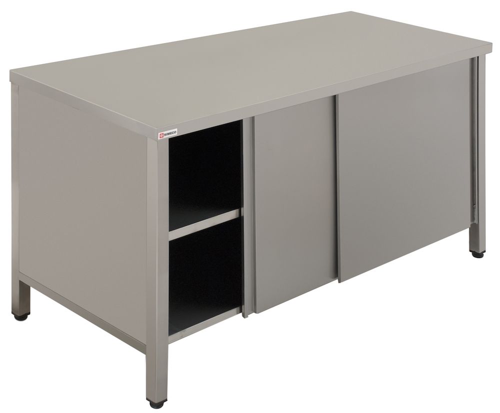 Simeco СЗE1206К используется на предприятиях общественного питания и торговли для приготовления различных блюд, а так же для хранения посуды и сыпучих продуктов. Модель закрыта с трех сторон. Имеет двери-купе и сплошную полку из нержавеющей стали. Каркас стола выполнен из нержавеющей стали AISI 430, столешница - из нержавеющей стали AISI 430. Ножки - труба 40х40 мм.