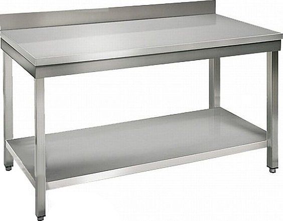 Производственный стол Kocateq SAT156A предназначен для раскатки теста и обработки ингредиентов для приготовления блюд, хранения посуды и кухонной утвари на предприятиях общественного питания и торговли. Столешница выполнена из нержавеющей стали AISI 304 толщиной 1 мм, усилена вкладкой из ДСП с ламинированием открытой сторон, каркас и полка - из нержавеющей стали AISI 201, ножки - из трубы квадратного сечения 40x40 мм, пятки - из пластика.