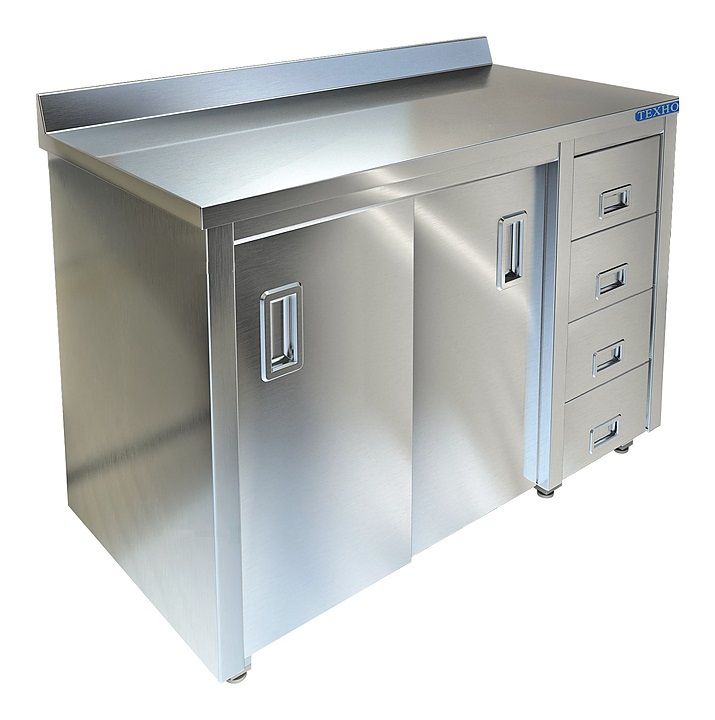 Производственный стол Техно-ТТ СПС-836/1507-П предназначен для разделки и обработки пищевых продуктов, а также для расстановки и хранения посуды и кухонного инвентаря на предприятиях общественного питания и торговли. Модель оснащена 4 выдвижными ящиками, расположенными справа, 1 полкой, 2 дверями-купе и регулируемыми по высоте ножками, что позволяет компенсировать неровности пола. Сварной корпус выполнен из нержавеющей стали AISI 430, столешница - из нержавеющей стали AISI 430 и ЛДСП, задняя стенка - из оцинкованной стали.