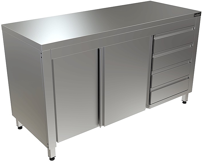 Стол производственный Кобор СТ/1-120/70/К используется на предприятиях общественного питания, торговли и пищевых производствах для хранения кухонной утвари и обработки различных ингредиентов перед приготовлением. Материал каркаса - высококачественная нержавеющая сталь (труба 40х40 мм), материал столешницы - высококачественная нержавеющая сталь AISI 430, усиленная листом ЛДСП (толщина 16 мм).
