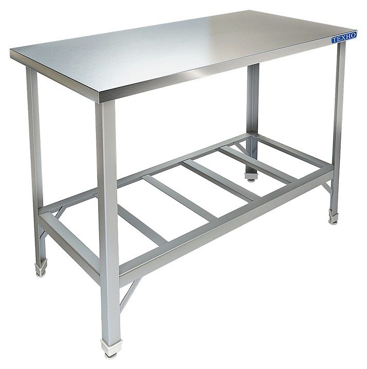 Производственный стол Техно-ТТ СП-159/1707 предназначен для разделки и обработки пищевых продуктов, а также для расстановки и хранения посуды и кухонного инвентаря на предприятиях общественного питания, торговли и пищевых производствах. Модель оснащена регулируемыми по высоте ножками, что позволяет компенсировать неровности пола. Материал разборного каркаса - уголок из нержавеющей стали AISI 430 (40x40 мм), материал столешницы - нержавеющая сталь AISI 304, материал полки-решетки - нержавеющая сталь AISI 430.
