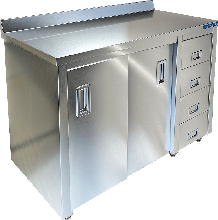 Производственный стол-тумба Техно-ТТ СПС-226/1007Н-П предназначен для разделки и обработки пищевых продуктов, а также для расстановки и хранения посуды и кухонного инвентаря на предприятиях общественного питания, торговли и пищевых производствах. Стол оснащен бортом, 1 распашной дверью и 4 выдвижными ящиками. Материал корпуса, полки и задней стенки - нержавеющая сталь AISI 430, материал столешницы - нержавеющая сталь AISI 304.