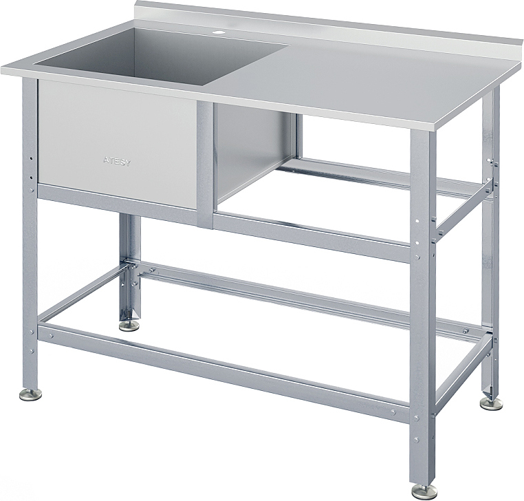 Моечная ванна ATESY ВСМС-Б-1Л.430-1010.580-1-02 серии Бюджет предназначается для мытья посуды и кухонного инвентаря, овощей и фруктов, а также для оттайки замороженных продуктов. Кромки ванны имеют безопасную фальцовку, углы зашлифованы. Ножки регулируются по высоте. Тип конструкции - разборная. Поверхность стола с внутренней стороны укреплена ламинированной ДСП, что увеличивает прочность и исключает прогиб. Материал каркаса - профиль из оцинкованной стали (толщина 1.2 мм), материал ванны - нержавеющая сталь AISI 430 (толщина 0.7 мм), материал опоры регуляторов высоты - нержавеющая сталь, ножки выполнены из пластика.