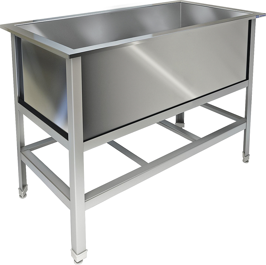 Моечная ванна Техно-ТТ ВМ-12/1257 используется на предприятиях общественного питания и торговли для мытья и ополаскивания продуктов, посуды и различного инвентаря. Модель с фартуком, закругленными краями и шумопоглощающей изоляцией снизу мойки оснащена обнижением, которое препятствует попаданию воды за пределы столешницы, и регулируемыми по высоте ножками, что позволяет компенсировать неровности пола. Сварной каркас выполнен из трубы из нержавеющей стали AISI 304, цельнотянутая мойка - из нержавеющей стали AISI 304 толщиной 1 мм, выпуск - из нержавеющей стали.