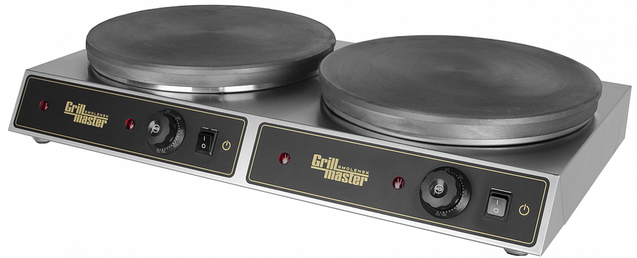 Блинница Grill Master Ф2БкрЭ 350 мм используется на предприятиях общественного питания, торговли и пищевых производствах для выпекания блинов. 2 рабочие поверхности (d = 350 мм), 2 ТЭНа специальной формы для раномерного нагрева поверхности. Регулировка температуры с помощью теплоизолированного термостата. Материал корпуса - нержавеющая сталь.