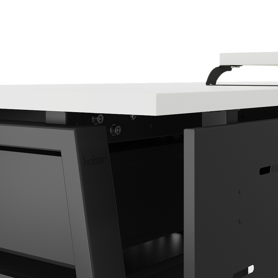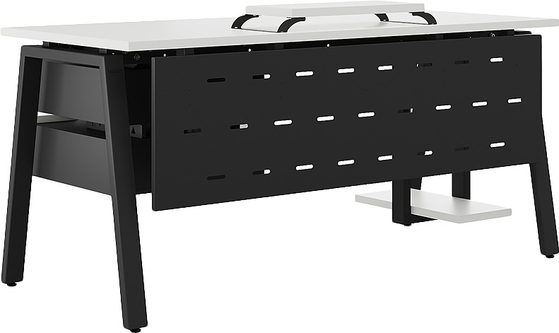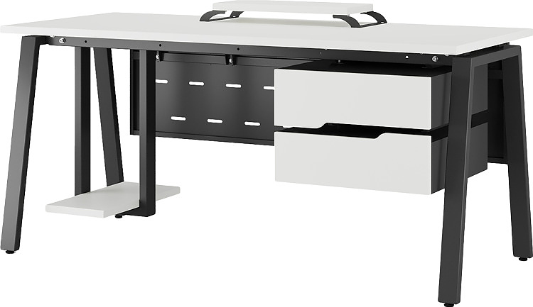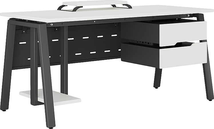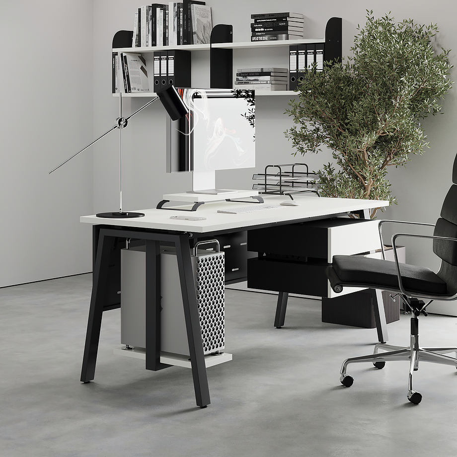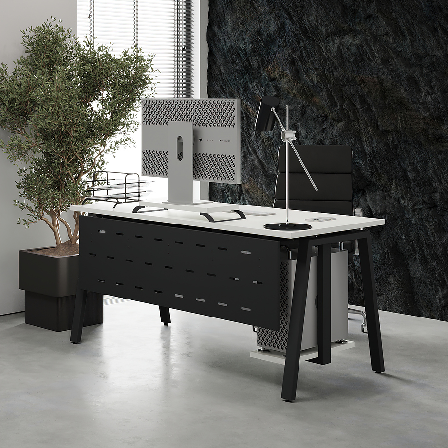 Офисный стол КОБОР A-120/60 black/premium используется в офисных помещениях и кабинетах руководителей. Модель оснащена А-образными опорами. Материал столешницы - прочный ЛДСП толщиной 25 мм, усиленная снизу металлическим каркасом, материал опор и каркаса - окрашенный металл.