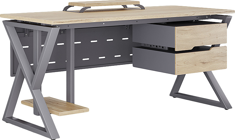 Офисный стол КОБОР W-140/70 graphite/natural используется в офисных помещениях и кабинетах руководителей. Модель оснащена W-образными опорами. Материал столешницы - прочный ЛДСП толщиной 25 мм, усиленная снизу металлическим каркасом, материал опор - окрашенный металл.