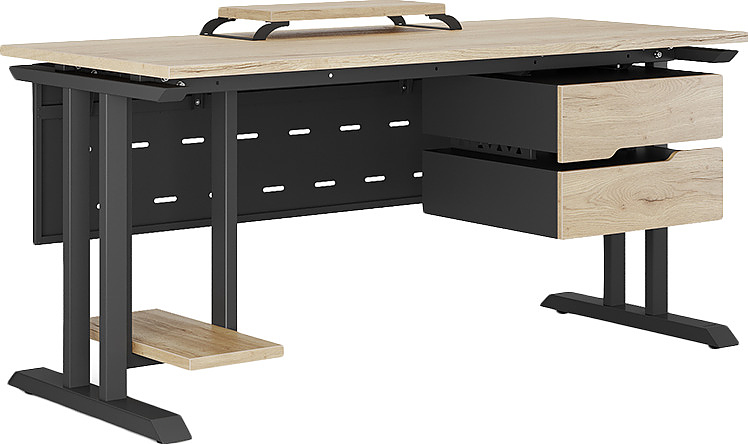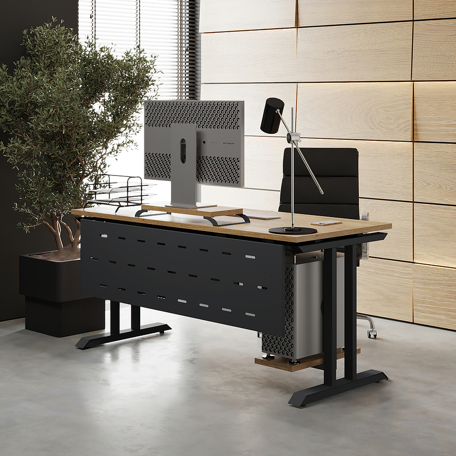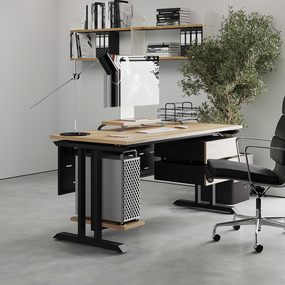 Офисный стол КОБОР T-120/60 black/natural используется в офисных помещениях и кабинетах руководителей. Модель оснащена Т-образными опорами. Материал столешницы - прочный ЛДСП толщиной 25 мм, усиленная снизу металлическим каркасом, материал опор - окрашенный металл.
