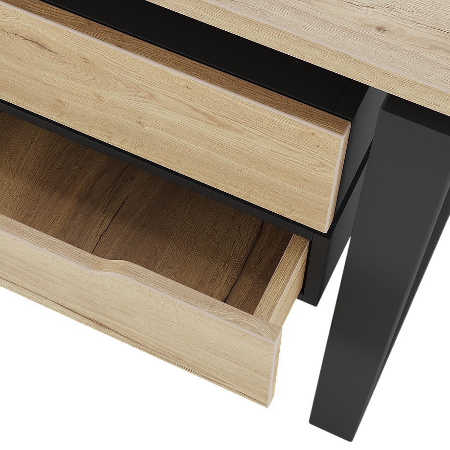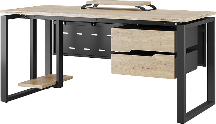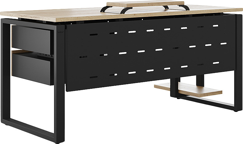 Офисный стол КОБОР O1-140/70 black/natural используется в офисных помещениях и кабинетах руководителей. Модель оснащена О-образными опорами. Материал столешницы - прочный ЛДСП толщиной 25 мм, усиленная снизу металлическим каркасом, материал опор - окрашенный металл.