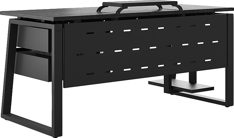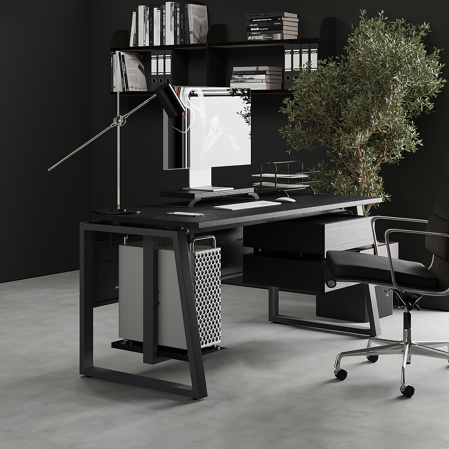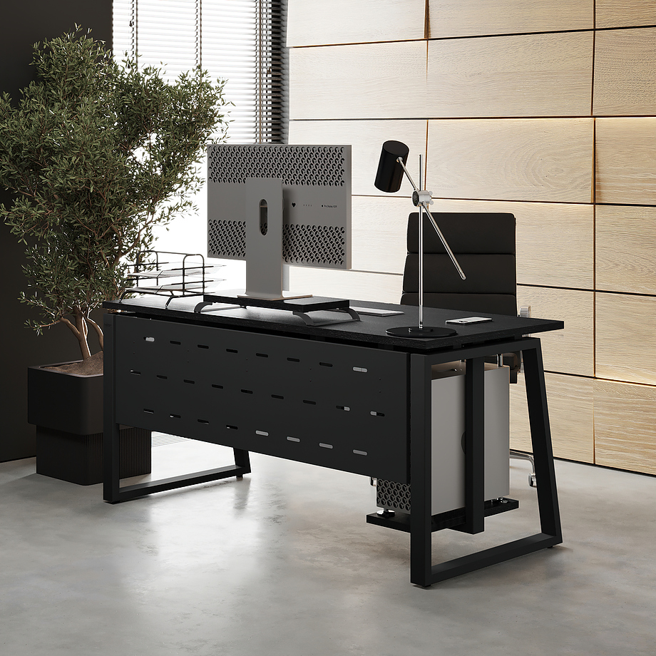 Офисный стол КОБОР TS1-120/60 black/wood используется в офисных помещениях и кабинетах руководителей. Модель оснащена опорами в форме наклонной трапеции. Материал столешницы - прочный ЛДСП толщиной 25 мм, усиленная снизу металлическим каркасом, материал опор - окрашенный металл.