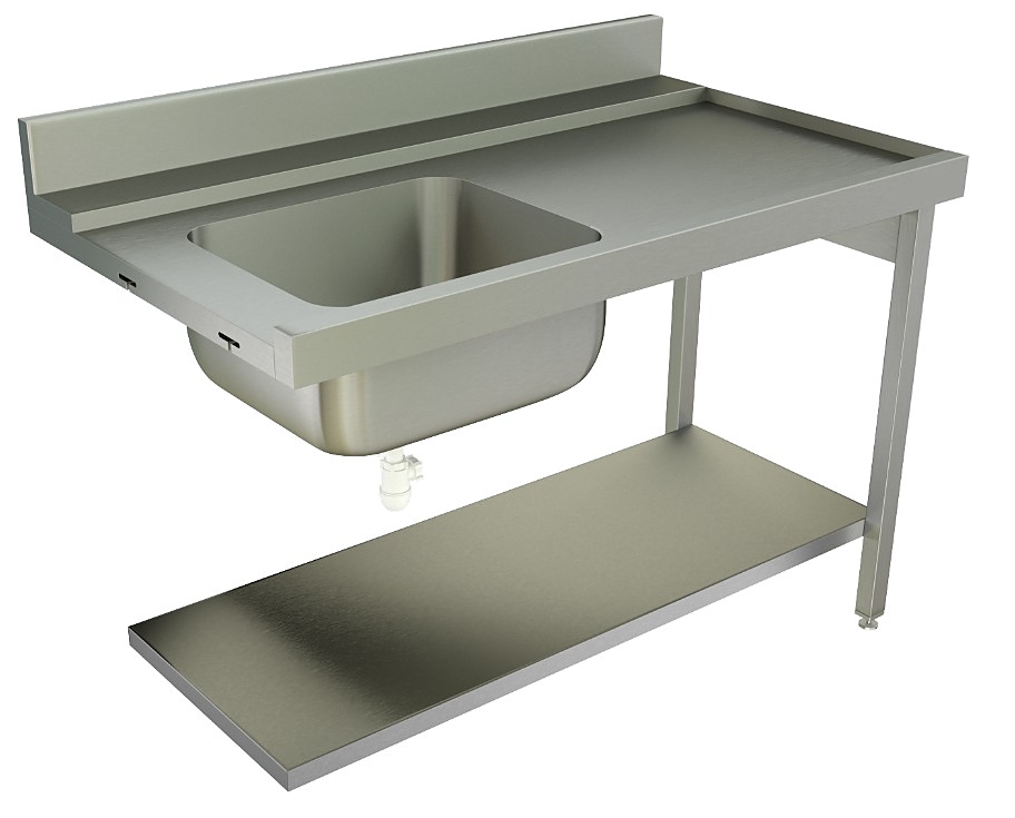 Стол для посудомоечной машины KAYMAN СПМ-111/0907 Л используется на предприятиях общественного питания, торговли и пищевых производствах совместно с купольной посудомоечной машиной Apach AC800 для ополаскивания посуды и другой кухонной утвари перед загрузкой. Материал каркаса - нержавеющая труба AISI 304 40х40 мм, столешницы - нержавеющая сталь AISI 304.