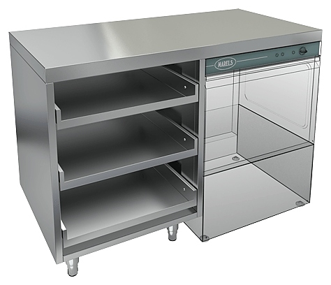 Открытый стол HICOLD НБМКБКП-12/5Л используется на предприятиях общественного питания, торговли, в гостиничном бизнесе и других сферах для комплектации барных стоек и размещения посудомоечной машины. Стол оснащен специальным крылом, под которое встраивается посудомоечная машина и 3 полками для корзин с бокалами. Материал корпуса - нержавеющая сталь AISI 430, столешница усилена листом ДСП.