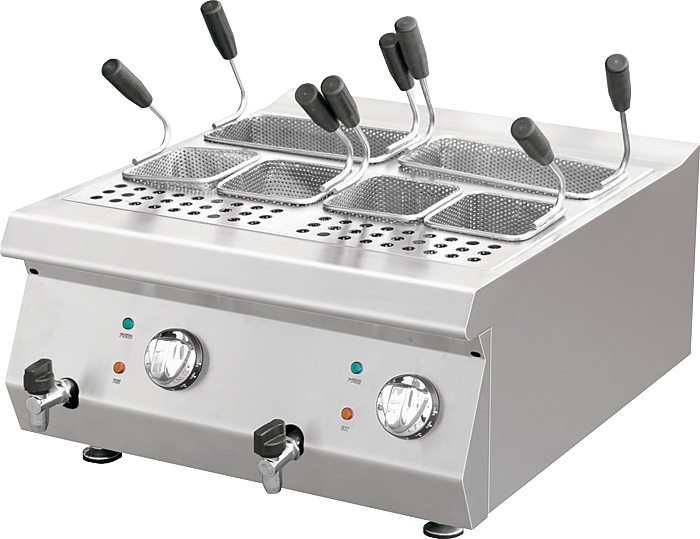 Макароноварка Kocateq 1M0CP1E класса Medium-Duty используется на предприятиях общественного питания и торговли для отваривания и размораживания кукурузы, фрикаделек, макаронных изделий, пельменей, вареников, овощей, фруктов и прочих продуктов. Модель оснащена механическим термостатом для регулировки температуры и защитным термостатом. Ванна выполнена из специальной стали толщиной 1,5 мм, декоративные ручки с накладками - из нержавеющей стали, поверхности, соприкасающиеся с продуктами, выполнены из нержавеющей стали AISI 304 толщиной 1 мм, дно и задняя стенка - из нержавеющей стали AISI 201 толщиной 1 мм.