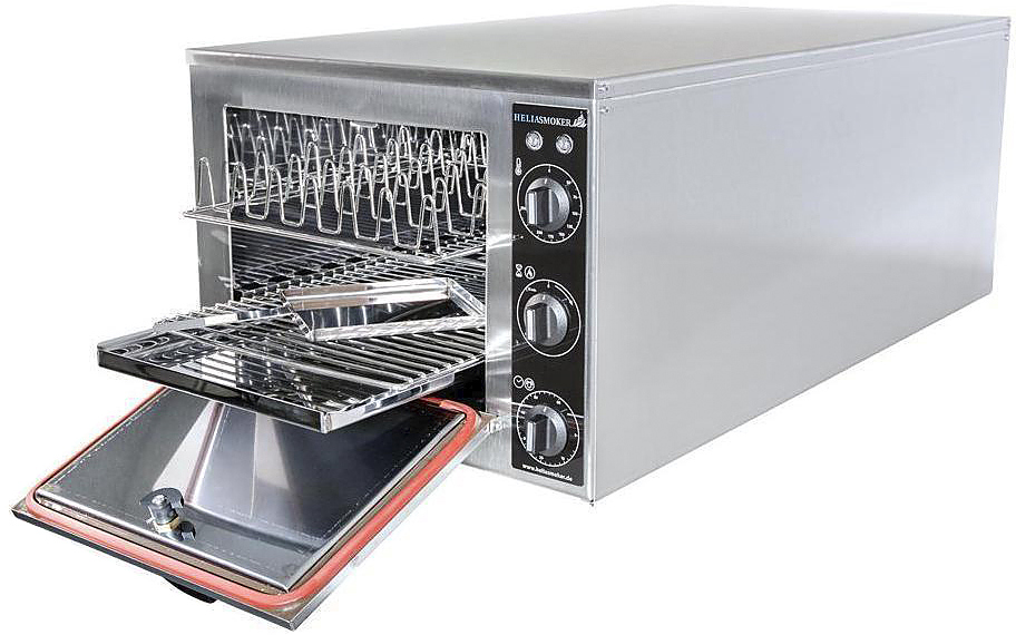 • Стандартное оснащение: поддоны и коптильные сковородки из нержавеющей стали, 2 решетки для форели, 2 решетка для макрели, 4 плоских решетки 30*40 см, коптильные опилки, образцы пряностей, книга рецептов, руководство по эксплуатации